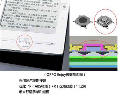 翻頁鍵要考慮拇指指腹大小以及表面弧度。OPPOEnjoy的翻頁鍵是一個(gè)類似波浪的設(shè)計(jì),保證指腹是在一個(gè)曲率半徑較大的弧線上進(jìn)行操作,非常接近自然狀態(tài)。這樣的設(shè)計(jì)的好處,可以在不增加鍵帽的視覺高度基礎(chǔ)上,增加鍵程,緩解按鍵過多的疲憊感,關(guān)于鍵程增加帶來的益處在手感篇詳談。