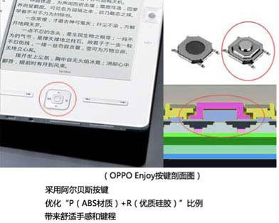 目前按鍵基本采用的都是ABS材質(zhì)類似電腦鍵盤,有過去網(wǎng)吧經(jīng)驗(yàn)的人就知道,通過看鍵盤上字跡的磨損程度和磨損的鍵位就知道近是流行CS還是勁舞團(tuán),字跡的耐磨度是一個(gè)不小的考驗(yàn)。目前一般是采用激光鐳雕或者絲印,但是電子書產(chǎn)品一般是白色的面殼,如果采用激光鐳雕會(huì)留下比較明顯的痕跡,但如果直接把絲印暴露在外面,長期摩擦字跡就會(huì)消失,為了解決這個(gè)矛盾,Enjoy創(chuàng)新采用一種夾層工藝,ABS表面首先噴涂底層(主要是著色),然后絲印,后在絲印上再采用噴油工藝,這樣就保證了絲印的耐磨度同時(shí)也隔絕了手上汗?jié)n對(duì)絲印的侵蝕。