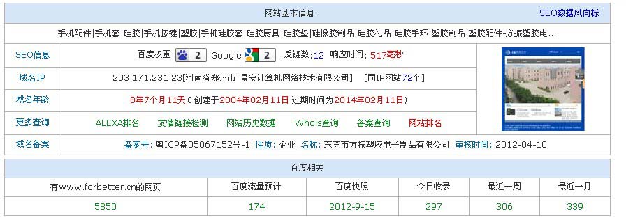 東莞博皓電子是今年上線的,正式的優(yōu)化花費了大概有3個月時間,計劃中的幾個有目標關鍵詞現(xiàn)在都排名第一了,接下來的三個月是將熱門關鍵詞硅膠、硅橡膠、按鍵優(yōu)化到百度首頁的前5名,外鏈做的比較好,網(wǎng)站的設計在整個硅膠行業(yè)的企業(yè)網(wǎng)站里面應該可以說是好的,缺點是上線不久,還處于百度的沙盒效應中,導致收錄數(shù)量很差,后期可能會有排名不穩(wěn)定的現(xiàn)象。