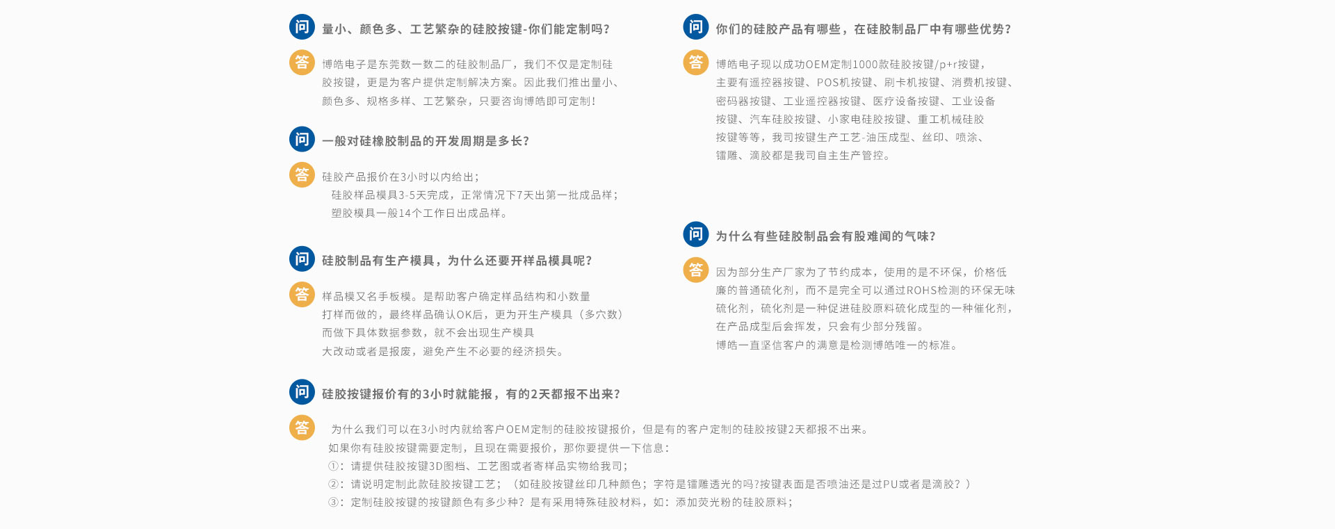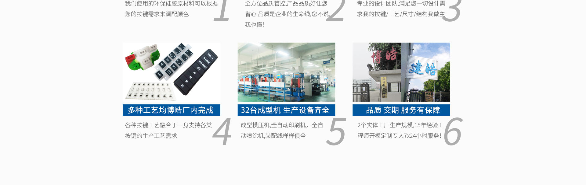 2014年國外重型機械機車控制器面板開始流行使用硅膠材質(zhì),國內(nèi)的徐州重工、三一重工、柳州重工等都開始紛紛嘗試,博皓電子也正是以為專注硅膠按鍵開模定制,車間80-90%均是生產(chǎn)硅膠按鍵,工藝齊全獲得很多客戶的信任,最終達成長期合作。