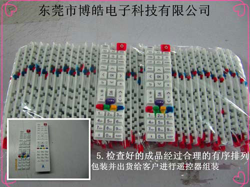 東莞市博皓電子科技有限公司是硅膠遙控器按鍵、電子詞典按鍵、P+R電子產(chǎn)品按鍵、防振硅橡膠腳墊、硅橡膠雜件、各類手機(jī)按鍵等產(chǎn)品專業(yè)生產(chǎn)加工的有限責(zé)任公司,公司總部設(shè)在東莞市橋頭鎮(zhèn)朗廈村景盛路98號(hào),擁有完整、科學(xué)的質(zhì)量管理體系。下面為大家介紹遙控器按鍵的實(shí)際實(shí)地生產(chǎn)流程: