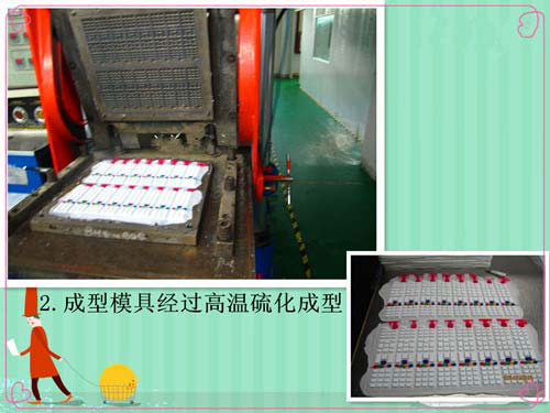 2.用已經(jīng)開(kāi)好的硅膠模具進(jìn)行硅膠原材料的高溫高壓硫化成型,如圖: