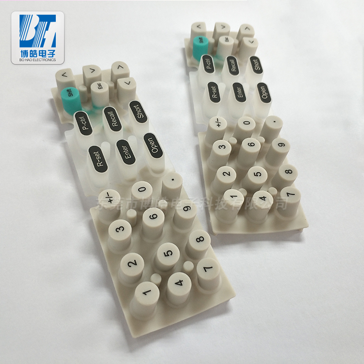 - 微機(jī)綜保按鍵,硅膠材質(zhì),采用多色成型和絲印工藝,該按鍵經(jīng)過荷重耐摩擦的測(cè)試,在博皓電子共有32臺(tái)油壓成型機(jī)可以保障大批量訂單交期穩(wěn)定。